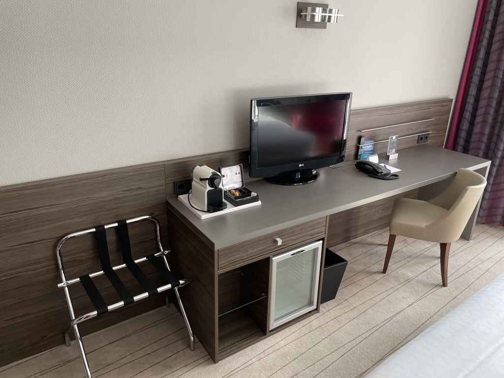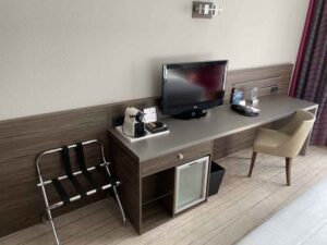 In unserem etwa 25 Quadratmeter umfassenden Premium-Zimmer dominierte das große Kingsize-Bett. Direkt an der Seite zum Innenhof stand noch ein Tisch mit einem Sessel. Auf der Längsseite des Zimmers gab es Kofferablage, ein Sideboard mit der leeren Minibar, Kaffeemaschine und Wasserkocher. Natürlich ist das Zimmer auch mit einem Fernseher ausgestattet, der an die Wand montiert ist.