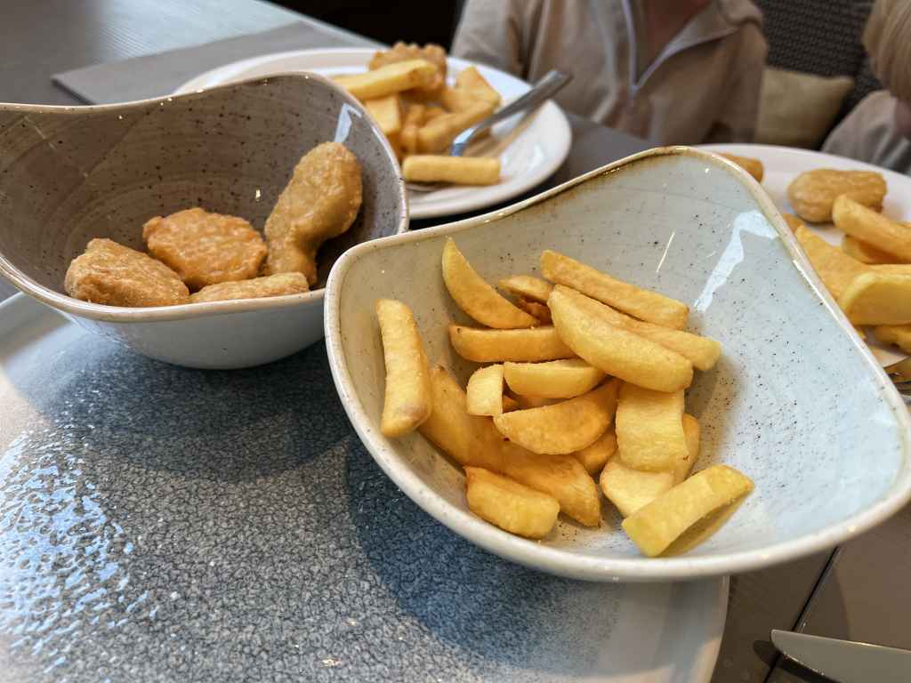 Als wir die Tür zur Lounge öffneten, begrüßte uns auch direkt unsere Gastgeberin. Sie erläuterte uns kurz das Buffet und informierte uns, dass auf Grund der begrenzten Anzahl Club-Gäste es keine warmen Speisen am Buffet gebe, aber auf Bestellung Nudeln (Papardelle) mit Tomatensoße oder Nudel mit grünem Pesto zubereitet würden. Wir bestellten zwei Portionen mit Pesto und eine für die Kinder mit Tomatensoße. Die Kinder bekamen außerdem noch Pommes mit Chicken Nuggets, was ein toller Service war.