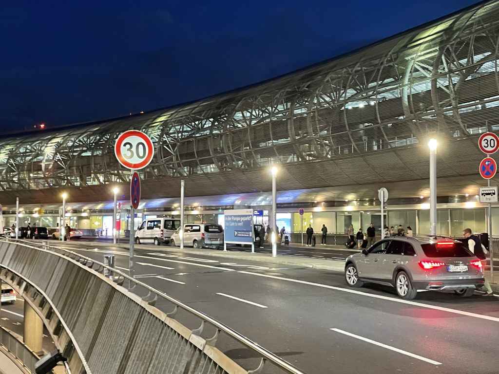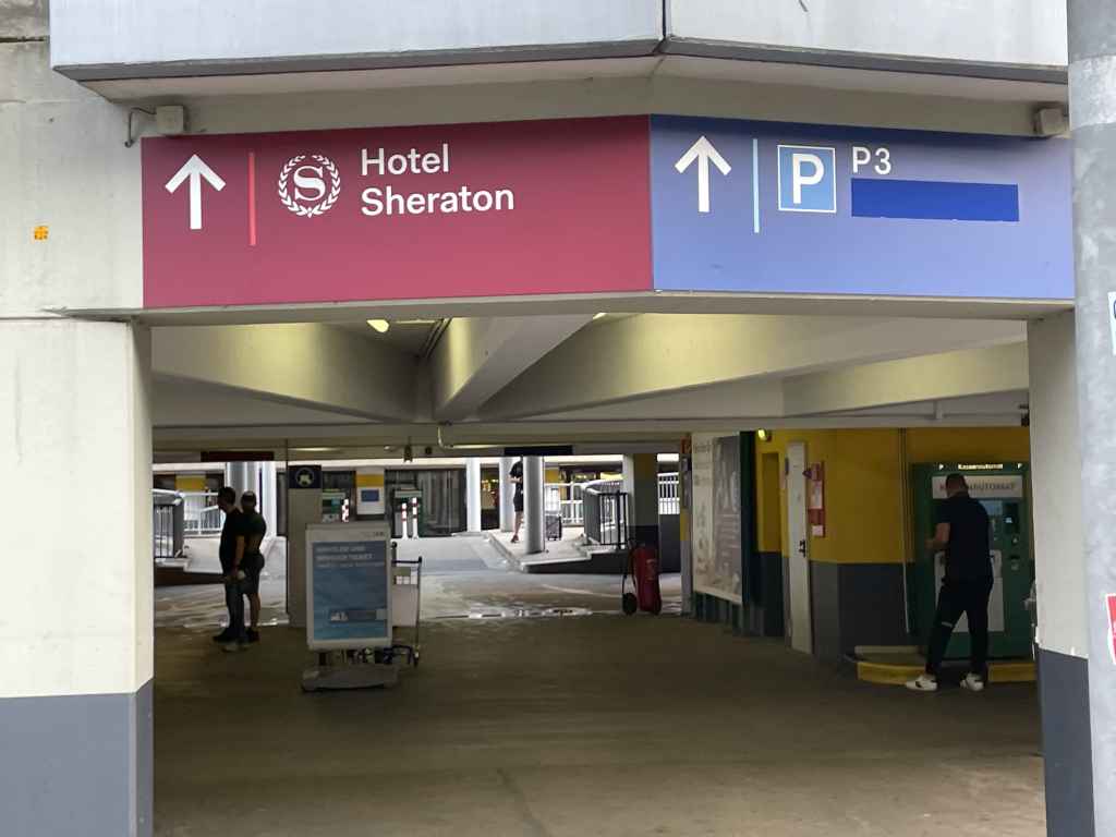 Das Sheraton Düsseldorf liegt direkt am Terminal des Flughafen Düsseldorf. Konkret ist es auf das Dach des Parkhauses P3 gebaut. Wer mit einem Flug ankommt, muss also nur auf der Ankunftsebene das Terminal verlassen und die Flughafenvorfahrt überqueren. Wer das an der richtigen Stelle tut, sieht relativ schnell den roten Torbogen, der zu den Fahrstühlen führt, mit denen man auf die Hoteletage gebracht wird.