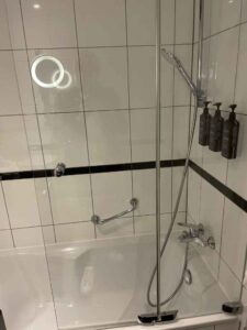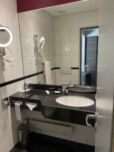 Die Bäder im Sheraton Düsseldorf Airport sind deutlich zu klein. Die Toilette befindet sich rückseitig direkt neben der Tür. Die Toilettenpapierhalter sind gegenüber am Waschtisch angebracht. Das lässt die Dimensionen in etwa erahnen. Die Badewanne, die gleichzeitig als Dusche diente, war dann rechter Hand zu finden und reichte gerade mal für Kinder aus.