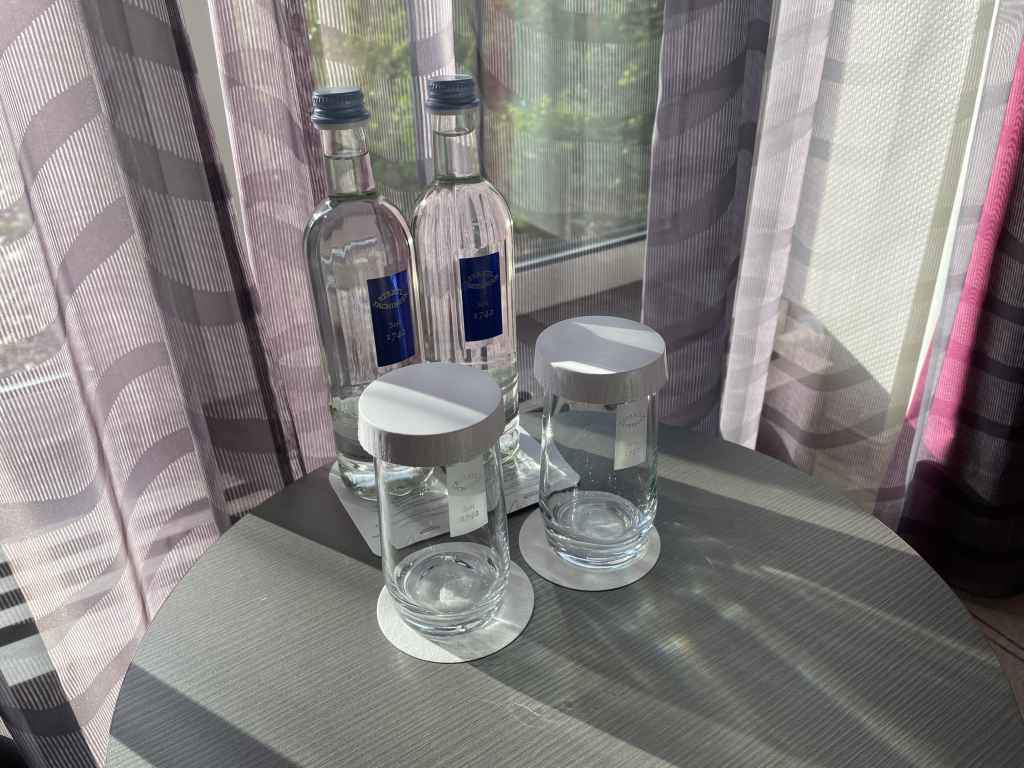 Wasser wurde in kleinen Glasflaschen bereit gestellt.