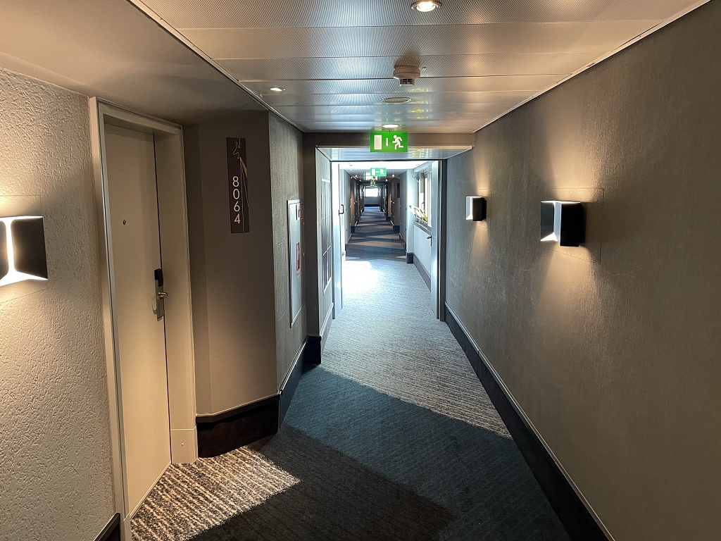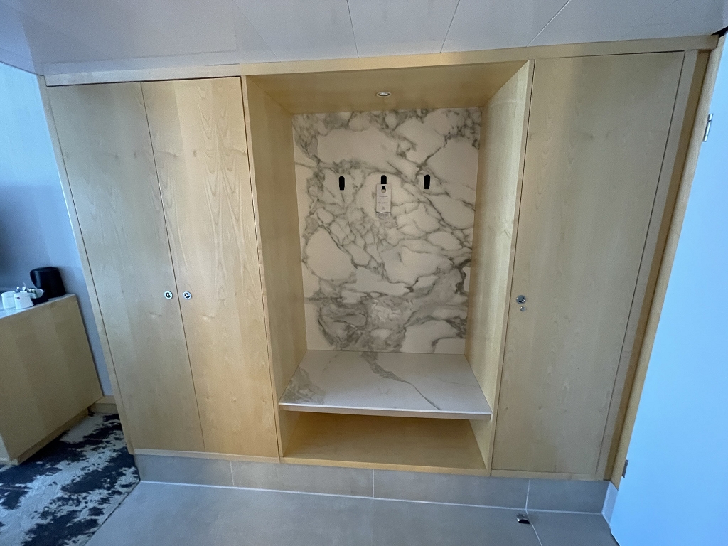 Nach Betreten des Zimmers befindet man sich im typischen Durchgang: zur Linken befindet sich das Bad, rechts erstreckt sich der Kleiderschrank. Hinter dem Durchgang erwartet einen der Hauptraum. Dieser ist hell gehalten. Weiß, Grau und ein wenig Schwarz sind die dominierenden Farben. Einen farblichen Akzent setzen die Möbel in Ahornholzoptik. Der Kleiderschrank ist zweigeteilt. In der Mitte befindet sich eine Aussparung, um den Koffer abzulegen und zu (ent-)packen.