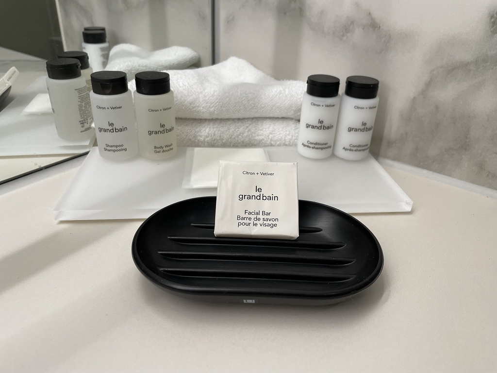 Das Bad wird vom Spiegel über dem Waschtisch beherrscht. Eine runde Lampe, die vor dem Spiegel hängt, sorgt für helles/grelles Gegenlicht. Die Pflegeserie im Bad ist von „Le grand bain“. Bereit stehen Duschgel, Shampoo, zweimal Conditioner und ein Seifenstück. Warum es zweimal Conditioner und keinmal Body Lotion gibt, verstehe ich nicht.
