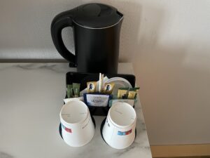 Für den Gast stehen Wasserflaschen sowie ein Wasserkocher mit Instantkaffe und Tee zur Verfügung.