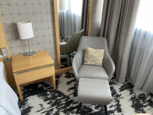 Vor der Fensterfront erwartet den Gast ein Sessel mit Fußhocker. Ein Schreibtisch mit Schreibtischstuhl ist ebenfalls vorhanden. Neben dem Schreibtisch – und ohne diesen zu verrücken nicht nutzbar – ist noch eine gepolsterte Sitzbank entlang der Wand. Außerdem sollte man die Anschlüsse an der Wand der Sitzbank ebenso wenig nutzen. Sonst wir es am Rücken unbequem. Bei den Steckdosen handelt es sich um deutsche und UK-Steckdosen. Hier hätte man ggf. direkt auf internationale, die die verschiedensten Stecker vertragen, setzen können.