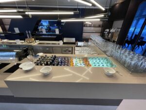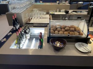 Vor der Loungeöffnung durften Menschen mit Zugangsberechtigung im Bereich der Bar Wasser und Softdrinks bestellen. Auf Nachfrage gab es dann auch Säfte sowie kleine Knabbereien. Diese wurden von einer Servicekraft an den Tisch gebracht.