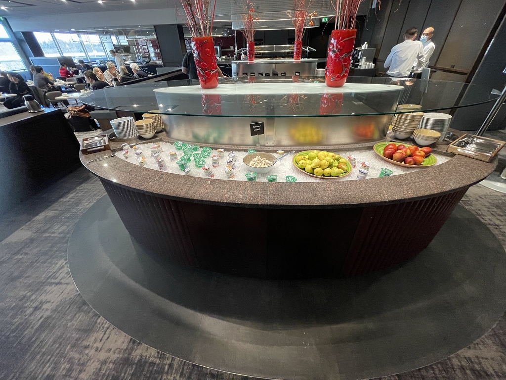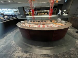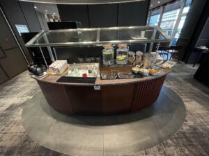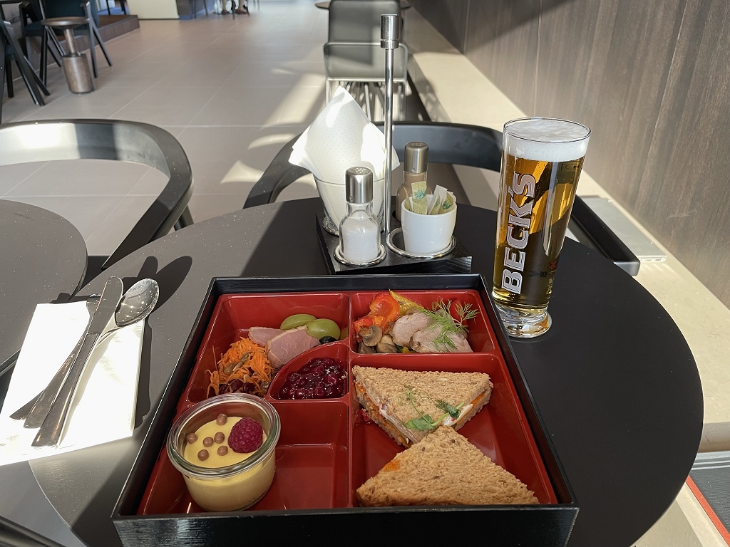 In den fünf Stunden konnten Gäste dann auf den wenigen Plätzen ausruhen und dabei Snacks sowie Getränke konsumieren. Im März gab es in der Lounge zunächst nur Obst und abgepackte Knabbereien wie Chips und alkoholfreie Getränke. Ab ca. 18 Uhr gab es dann Bentoboxen mit kleinen Menüs und auch alkoholische Getränke. Das Essen war abwechslungsreich und geschmacklich voll in Ordnung.