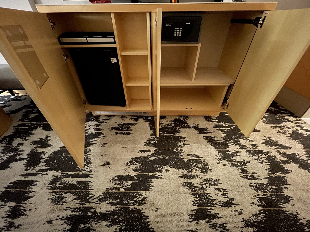 Gegenüber dem Bett ist auf einem Lowboard der Fernseher platziert. In dem Lowboard ist auch der Zimmersafe versteckt. Hinter der Tür daneben verbarg sich der unhörbare Kühlschrank.