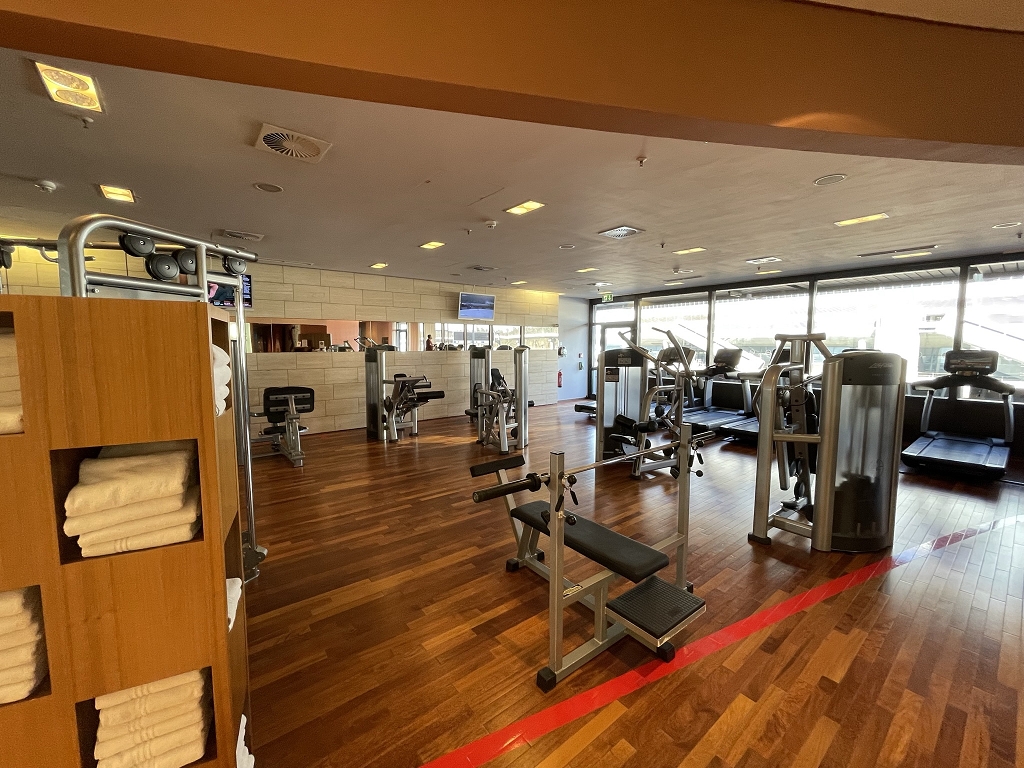 Der Fitnessbereich befindet sich auf der tiefsten Ebene des Hotels. Der ca. 400qm große Raum ist mit vielen verschiedenen Geräten ausgestattet. Es gibt ein halbes Duzend Cardiogeräte, Geräte im bestimmte Muskelgruppen geführt und isoliert zu trainieren, einen Cage sowie einen Bereich mit Freigewichten. Auch Klimmzugstangen sind vorhanden. Für Gäste der beiden Hotels werden Handtücher bereitgestellt. Das Gym ist rund um die Uhr geöffnet, der Zutritt erfolgt per Zimmerkarte.