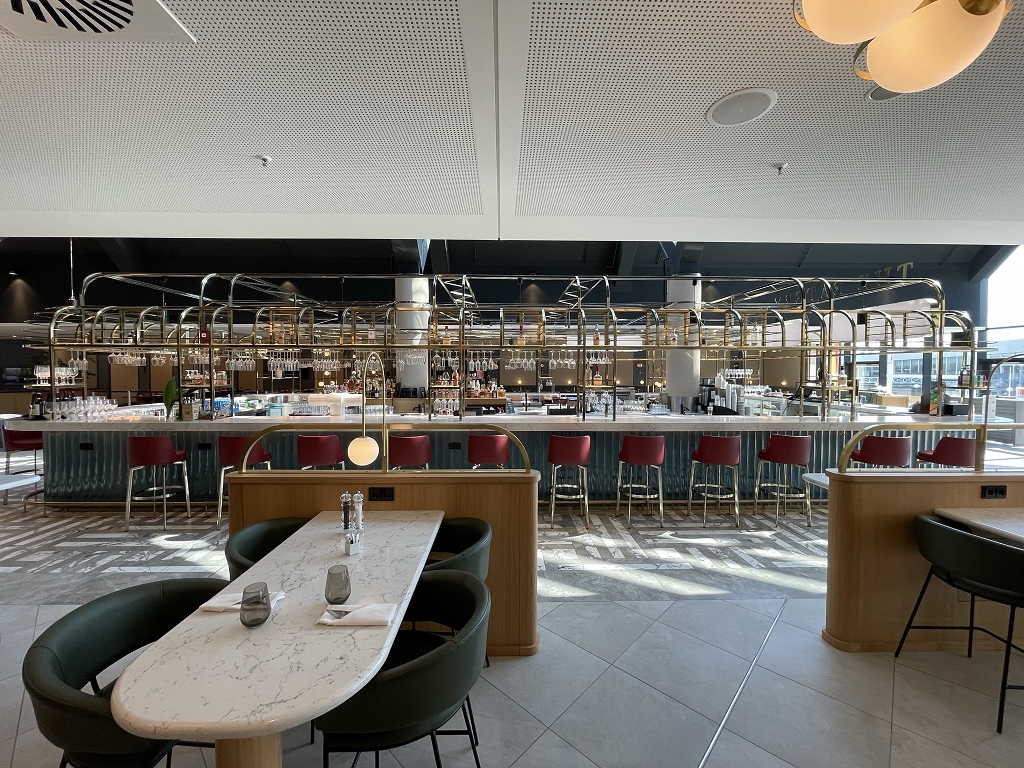 Die Lobbybar wirkt als wäre sie dem Film „Der große Gatsby“ entsprungen (oder auch der Serie Babylon Berlin). Messingelemente und Licht wirken verspielt und zaubern ein Flair der 1920er Jahre in die große Lobby des Flughafenhotels. (Die Lobbybar ist nicht mit der „The Bar“ zu verwechseln, die während des Aufenthalts geschlossen war.)
