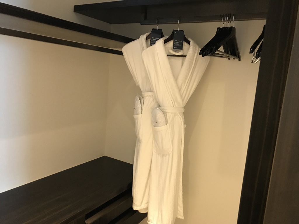 Neben der Minibar befand sich der begehbare Kleiderschrank, der mit einem Bügelbrett und -eisen, Bademänteln und Hausschuhen ausgestattet war.