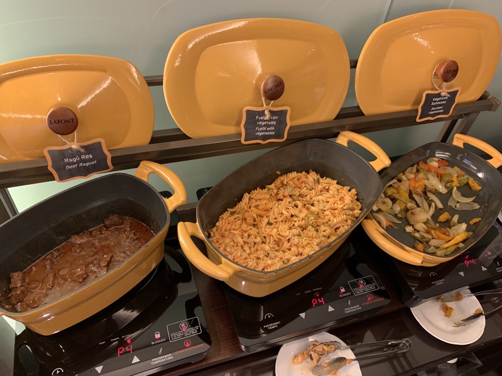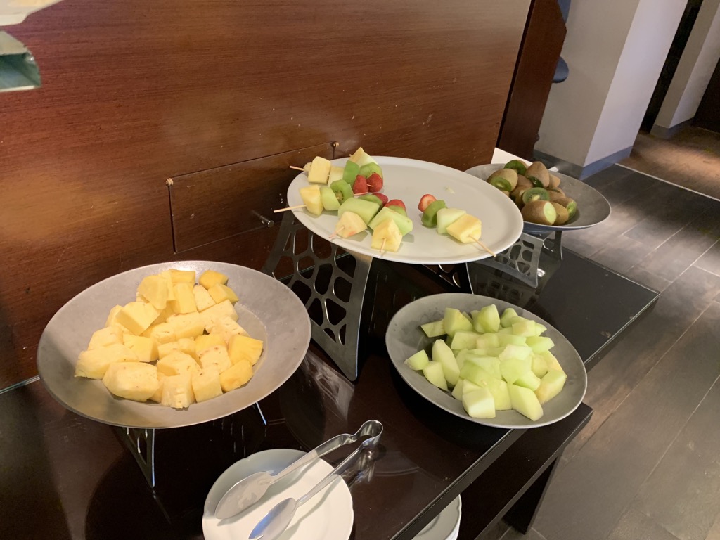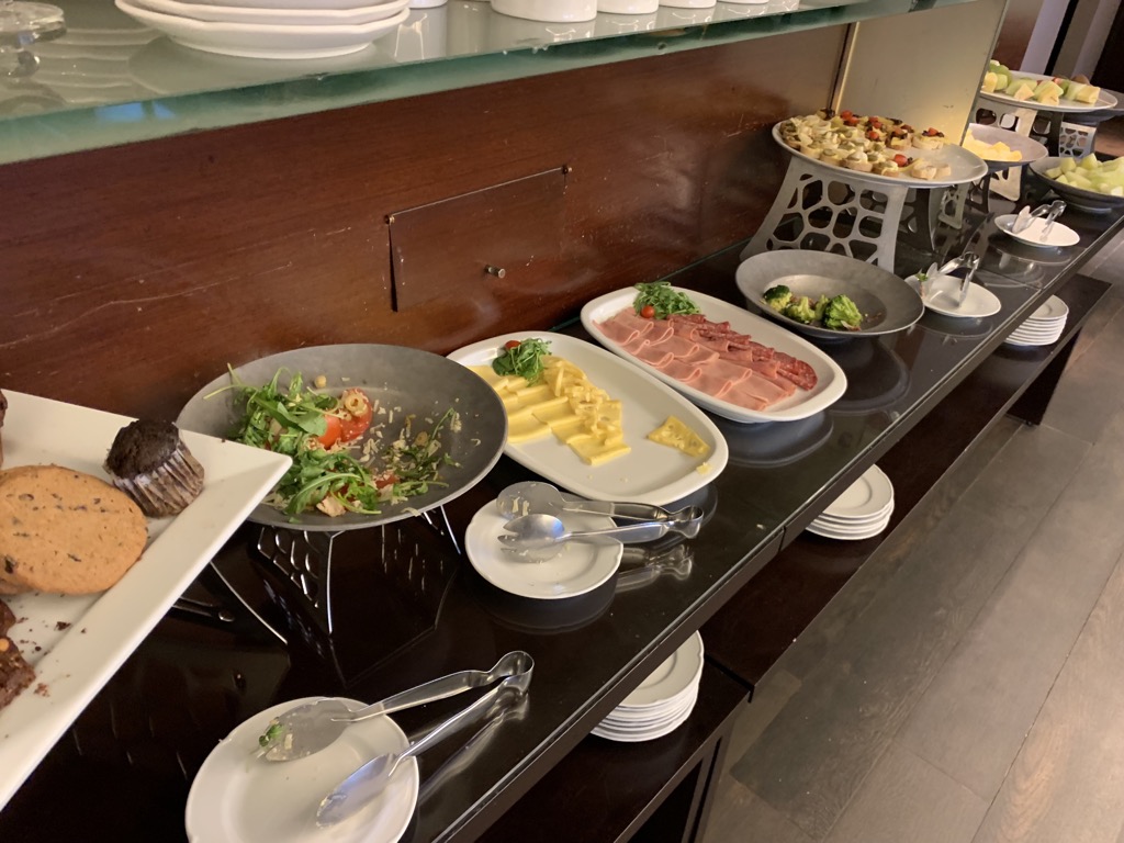 In der Club Lounge werden auch zu verschiedenen Zeiten des Tages kleine Speisen und Snacks angeboten. Ich habe die Lounge Abends zur Happy Hour besucht und hier gab es neben Obst, Salaten auch Aufschnitt und Käse. Zusätzlich gab es noch drei warme Gerichte: Nudeln, Rindergeschnezeltes und Gemüse.