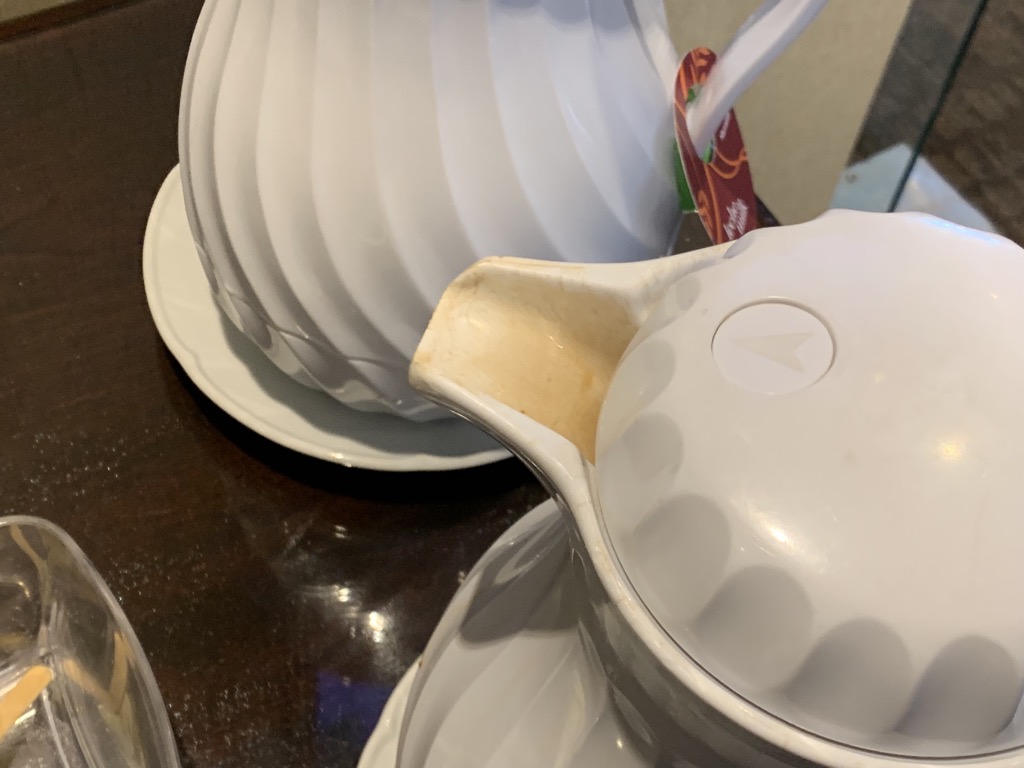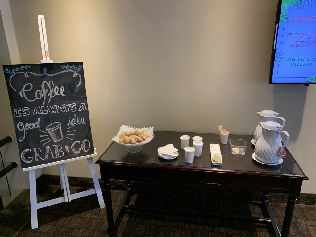Ganz Sheraton typisch gab es vor dem Frühstücksraum einen Tisch mit Kaffee to go und kleine süße Teilchen. Dass die hier aufgestellten Kaffeekannen total versifft waren, hat leider das Gesamtbild vom Hotel nur noch einmal unterstrichen.