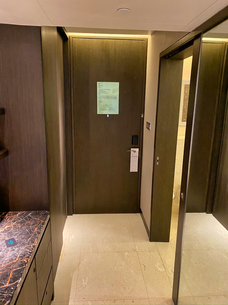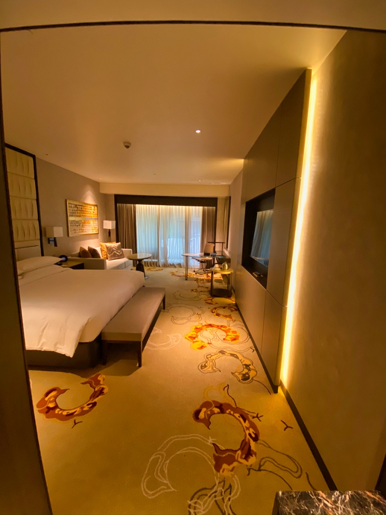 Ich hatte – gänzlich ungewohnt – eine Rate mit Hoteltransfer gebucht. Das sollte eher der Bequemlichkeit und der Generierung von Punkten als allem anderen dienen. Jedenfalls wurde ich von einem sehr freundlichen und gut aufgelegten Chauffeur am vereinbarten Treffpunkt in Empfang genommen und zum Fahrzeug begleitet. Sobald ich das Terminal verließ musste ich schmunzeln. Das Hotel liegt ca. 200m Luftlinie davon entfernt. Aber: die Fahrt dauerte trotzdem fast zehn Minuten, da es erst durch verschiedene Checkpoints und dann auf einem sehr indirekten Weg zum Hotel ging. Die Straßenführung gibt es nicht anders her.
