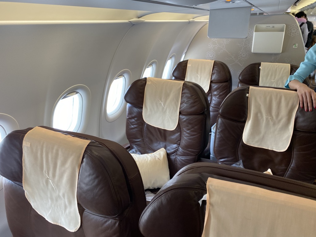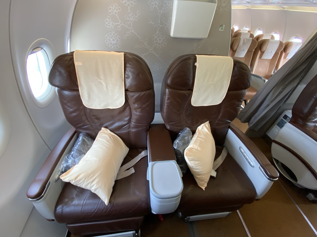 Die Sitze oder besser Sessel sind für den kurzen Flug mehr als komfortabel. Mit einer europäischen Business Class, bei der nur der Mittelsitz frei bleibt, ist es nicht zu vergleichen. Jeder Sitz ist mit braunem Leder bezogen uns bietet reichlich Platz. Mit meinen 1,74m Größe hatte ich noch verhältnismäßig viel Platz zum Vordersitz.