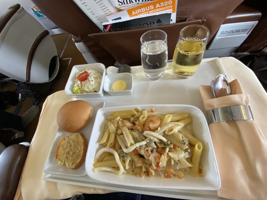 Noch vor dem Start wurde uns ein Begrüßungsgetränk und ein kaltes Tuch angeboten. Damit fühlen wir uns im Flugzeug immer richtig „angekommen“. Direkt nachdem die Anschnallzeichen erloschen waren, wurden weitere Getränke gereicht und mit dem Service begonnen. Es gab drei Gerichte zur Auswahl.