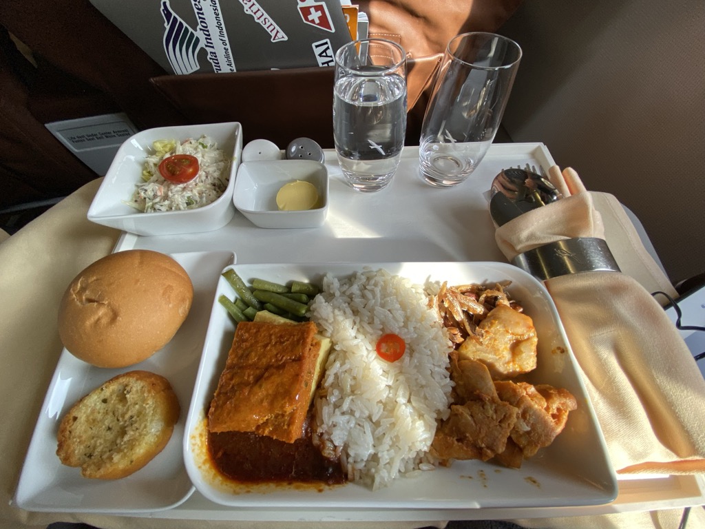 Ich hatte das Gericht mit Reis. Neben dem Reis waren im Gericht noch kleine Fische, dies war wohl das Nationalgericht von Malaysia (laut der Flugbegleiterin). Außer dass ich keinen Fisch mag, war das Essen super. Auch Christoph hat es sehr gut geschmeckt.