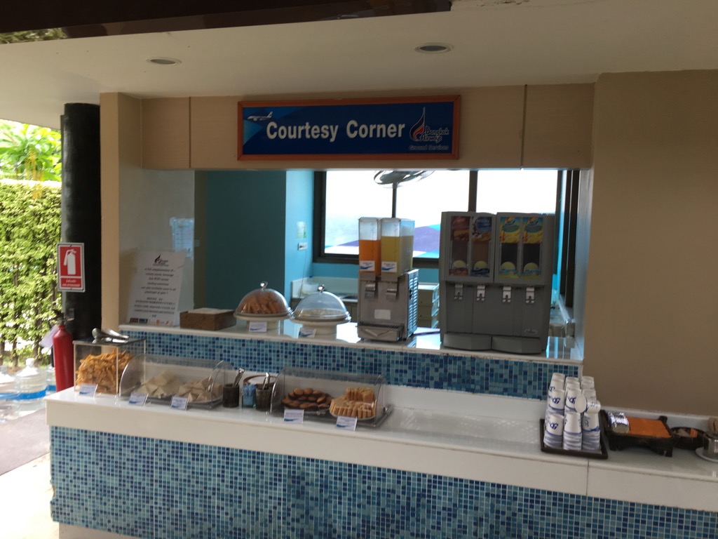 Die Gates in Koh Samui sind selbst schon fast wie eine Lounge gestaltet. Dabei gibt es neben schön gestalteten Sitzgruppen auch einen kleinen Counter, an welchem sich auch SilkAir Economy Class Passagiere kostenlose Getränke und Snacks holen können.