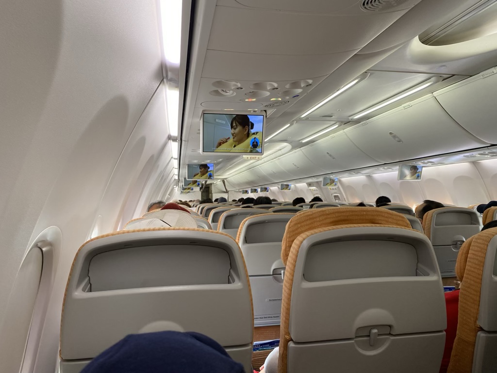Auf dem Weg zum Boarding hatte ich meinen ersten Berührungspunkt mit den Corona-Kontrollen, denn auf dem Weg zum Gate wurde mehrere Male Temperatur gemessen und immer mehr der wenigen Passagiere trugen einen Mundschutz. Am Gate angekommen wurde direkt zum Boarding aufgerufen. Noch schnell die Sicherheitskontrolle, welche in Singapur immer vor dem Gate ist passieren und ab in den erstaunlich leeren Flieger.