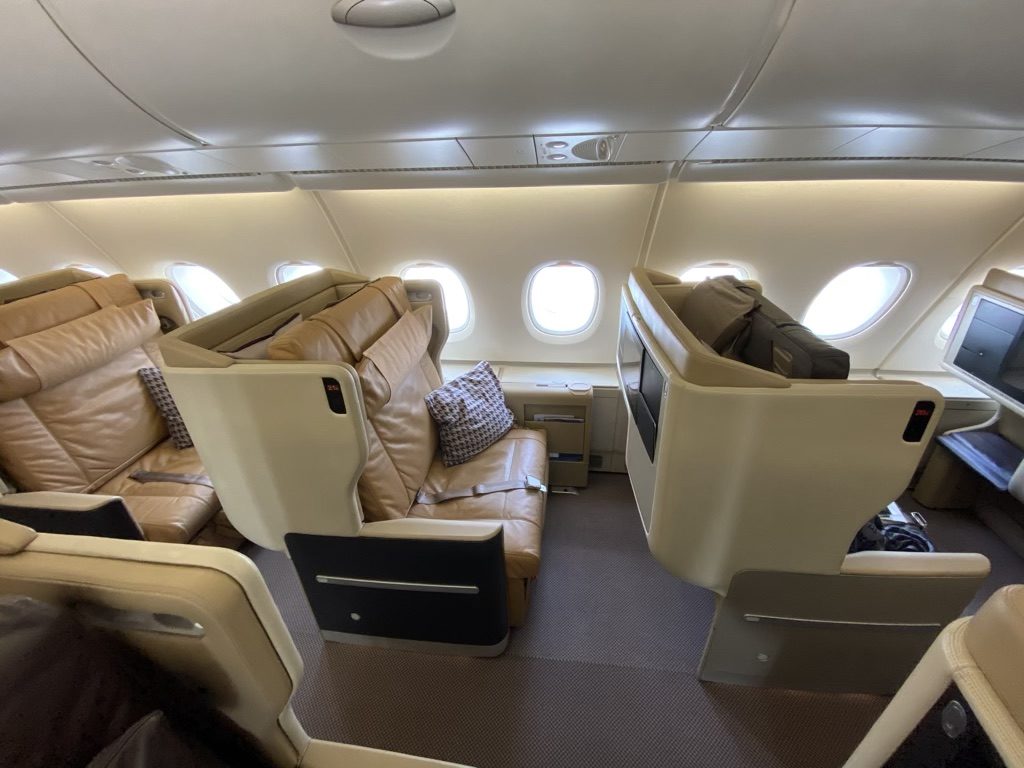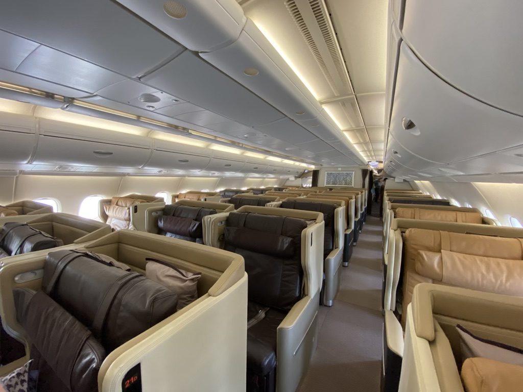 Der für meinen Flug eingesetzte Airbus A380 bot im Hauptdeck Platz für 12 Passagiere in der luxuriösen Suite-Class. Gefolgt von 36 Gästen in der Premium Economy Class und 245 Passagieren in der Economy Class. Die Business Class hingegen befand sich im Upperdeck und erstreckte sich vom Bug 15 Reihen in einer 1-2-1 Konfiguration mit 60 Plätzen. Die Business Class ist in ein größeres (Reihe 17-27) und ein kleineres Abteil (Reihe 11-16) geteilt. Im Heck befand sich noch ein weiteres Economy-Class Compartment mit Platz für weitere 88 Passagiere.