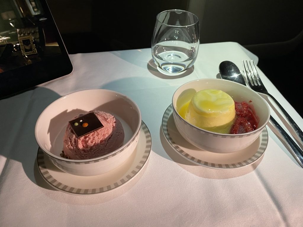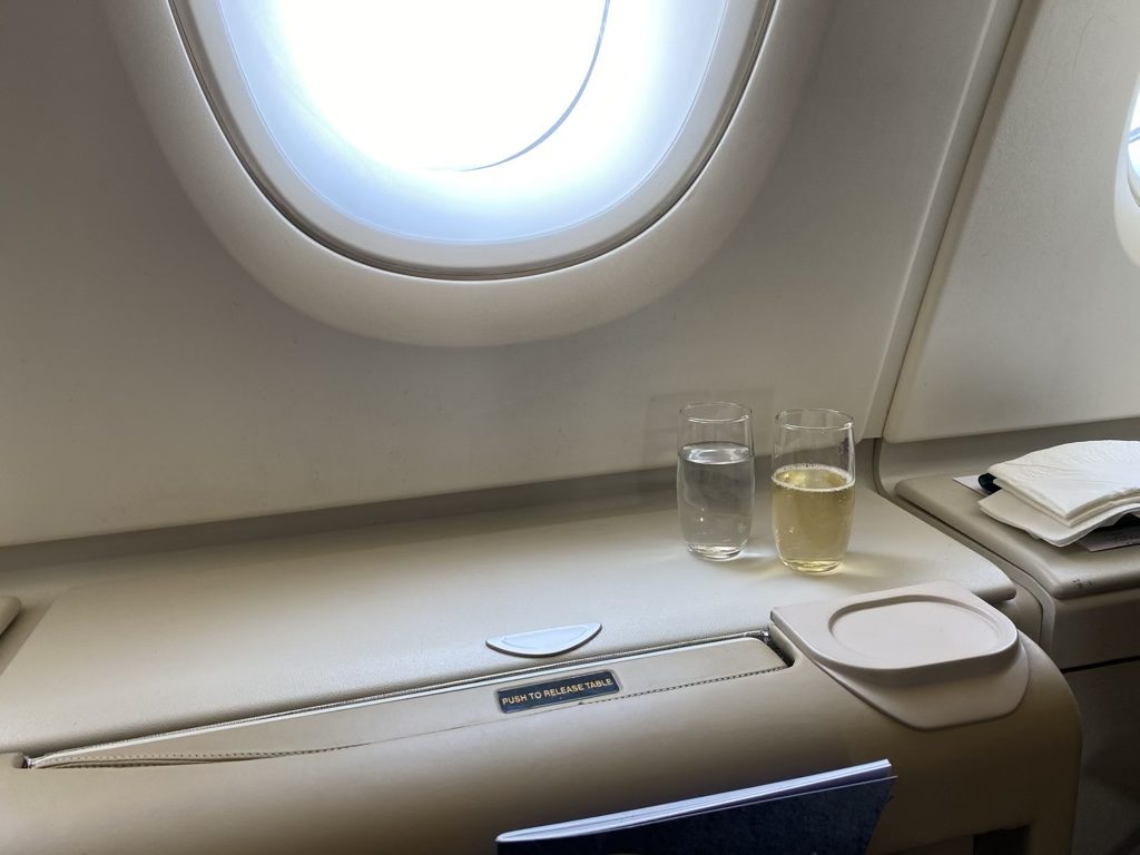 Der Service begann in dem Moment, wo ich das Flugzeug betrat. Ab diesem Moment wurde ich bis zu meinem Platz begleitet und innerhalb von kürzester Zeit lernte ich die für mich zuständigen Flugbegleiterinnen kennen. Diese haben mir direkt ein Glas Champagner angeboten und überreichten mir die Speisekarte für den Flug.