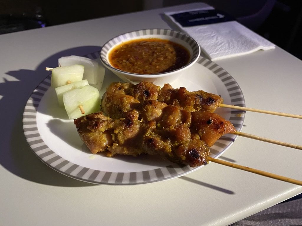 Ein halben Film später wurde ich gefragt, ob es in Ordnung wäre die Kabine abzudunkeln, da der andere Passagier in meinem Compartment gerne schlafen möchte. Nach wenigen Minuten war die Kabine dunkel und er konnte in Ruhe schlafen und für mich startete das Menü. Den Start machten die extrem lecken Singapore Chicken Satay Spieße.