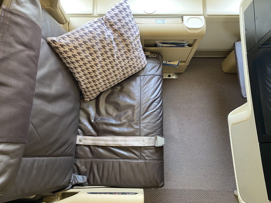 Angekommen an Bord wurde ich zu meinem Platz 20 A begleitet. Mit „Platz ist hier das richtige Wort“ habe ich den Swiss First Class Sitz beschrieben. Platz trifft definitiv auch auf den (alten) Business Class Sitz von Singapore Airlines zu. Das Platzangebot, vor allem in der Breite des Sitzes war riesig. Kein Wunder, bei einer Sitzbreite von 86 cm und einem Sitzabstand von  1,4 m. Doch vor allem durch die seitliche Ablage, welche typisch für den A380 ist, wirkte der Sitz noch großzügiger.