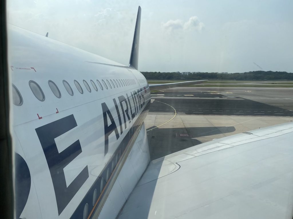 Wie an jedem Gate im Changi Airport findet die Sicherheitskontrolle direkt am Abfluggate statt. Diese dauerte erneut nur sehr kurze Zeit und das „Boarding“ war in vollem Gange. „Boarding“, da der Flug wirklich spärlich gebucht war. Wie ich an Bord erfuhr, saßen mit mir noch vier Passagiere in der Business Class und 85 Passagiere in der Economy Class, in einem Flugzeug mit Platz für 441 Passagiere.