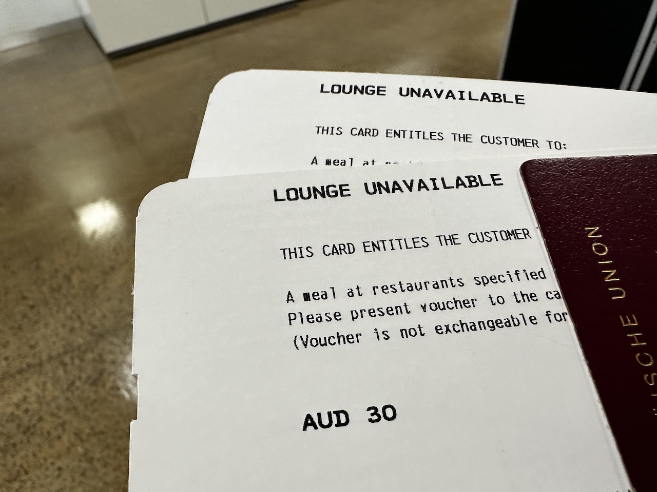 Am Flughafen Darwin war an den Schaltern ziemlich viel los, als wir uns angestellt haben, hat uns jemand gefragt ob wir Business- oder Statuskunden sind und uns nach vorne mitgenommen. Wir waren die Koffer los und erhielten die Bordkarten, leider gab es keine zusammenhängende Sitze mehr. Eine Lounge wurde in Darwin nicht angeboten, dafür händigte man uns 30AU$ Gutscheine für die Restaurants und Geschäfte am Airport aus- genug für ein Mittagessen im Terminal.