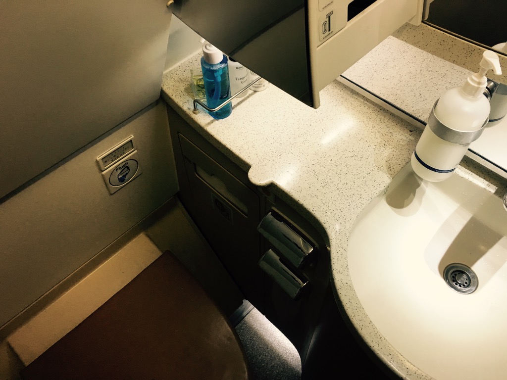 Zwischen der Business Class und der Economy Class befinden sich die zwei Waschräume der Business Class. Diese waren sehr sauber, unterschiedenen sich allerdings kaum von normalen Flugzeugtoiletten. Lediglich die umfangreichen Amenities in den Toiletten sind hier hervorzuheben. Es ist durchaus sehr angenehm, dass man hier auch auf einem 2 Stunden Flug Zahnbürsten, Rasierer und verschiedene Cremes findet. Daher lässt es sich auch verschmerzen, dass es kein Amenity Kit für Business Class Passagiere gibt.