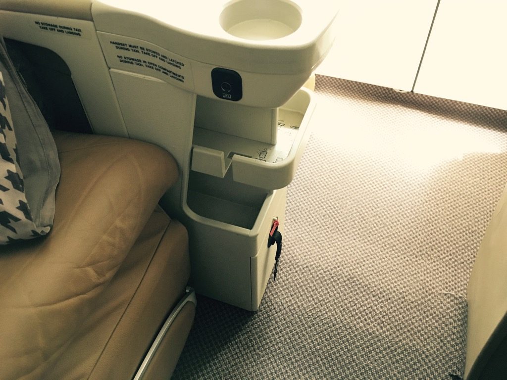 Was mir auch bei diesem Flug wieder sehr positiv aufgefallen ist, waren die vielen Staufächer am Sitz. Neben zwei Ablagen unter dem Fernseher, gab es auch noch Stauraum unter der Armlehne, sowie ein Literaturfach für jeden Passagier im Vordersitz.