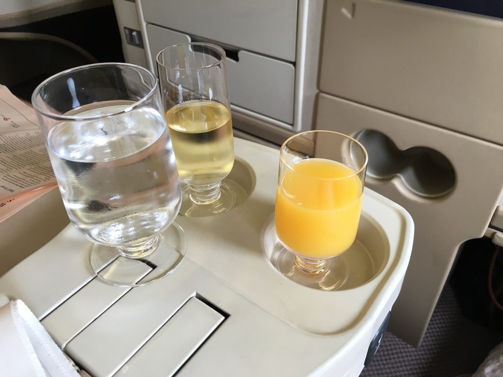 Direkt nachdem wir uns gesetzt haben, wurde uns von einem Tablett ein Willkommensgetränk angeboten. Zur Auswahl standen Champagner, Wasser und Orangensaft. Auch heiße Tücher und Zeitschriften, sowie Magazine wurden noch vor dem Start allen Business Class Passagieren angeboten.