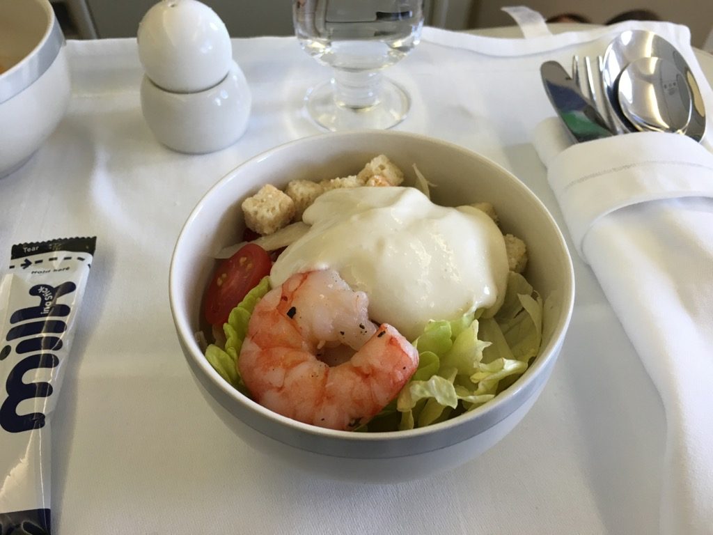 Die Crew auf diesem Flug hat sich dazu entschieden, erst die Vorspeise und anschließend die warmen Hauptspeisen zu servieren, statt alles auf einmal. Ich persönlich finde dies auch besser.