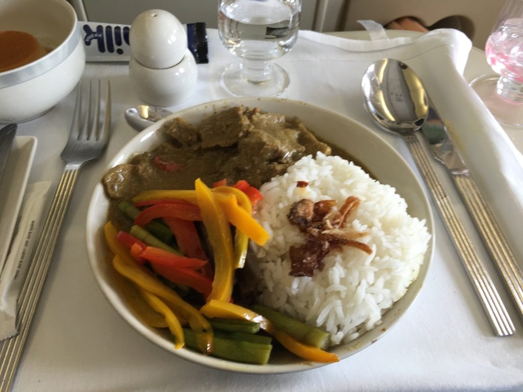 Was mich ein wenig verwirrt ist der Service, bei welchem erst der linke und dann der rechte Gang bedient wird. Auch dass man beim Service sehr unflexibel ist, sehe ich als nicht ganz ideal an. Dennoch ist es sicherlich eine sehr angenehme Art und Weise um die 1.000 Meilen von Bali nach Singapur zu fliegen.
