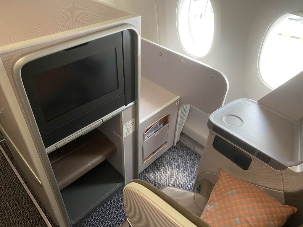 Die Business Class Sitze lassen sich in ein komplett flaches Bett verwandeln. In einem kleinen Fach findet Ihr Kopfhörer, mit denen ihr Euer privates IFE mit ausreichend großem Bildschirm nutzen könnt. Das Entertainment-Programm lässt sich entweder per Fernbedienung oder Touch am Bildschirm bedienen. Wer sich im Detail für den Sitz erinnert, wird in meiner Singapore Airlines Dreamliner Review fündig.