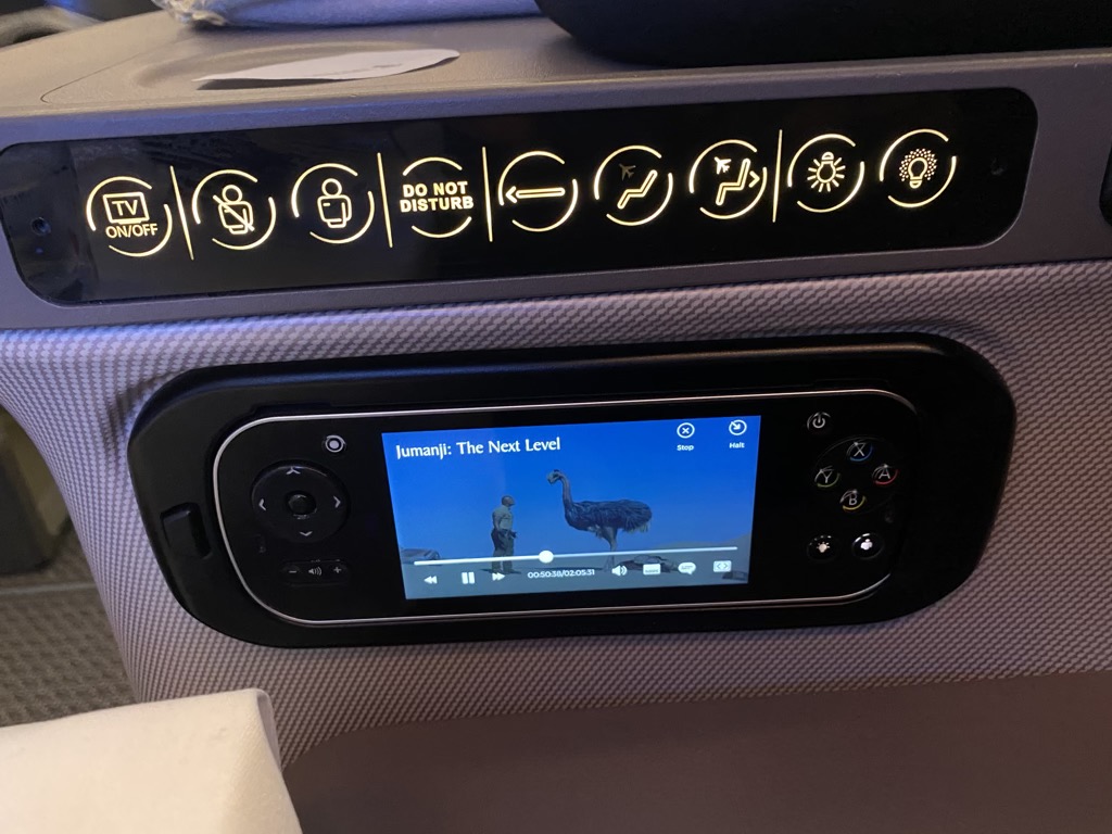 Am Sitz befinden sich genügend Lademöglichkeiten für all Eure Geräte. Auch designtechnisch hübsch umgesetzt fand ich die Sitzverstellung sowie die Fernbedienung, welche gleichzeitig als zweites Display funktionierte. Die meiste Zeit habe ich mir auf dem kleinen Display die Flightmap anzeigen lassen, welche sehr gut umgesetzt war.
