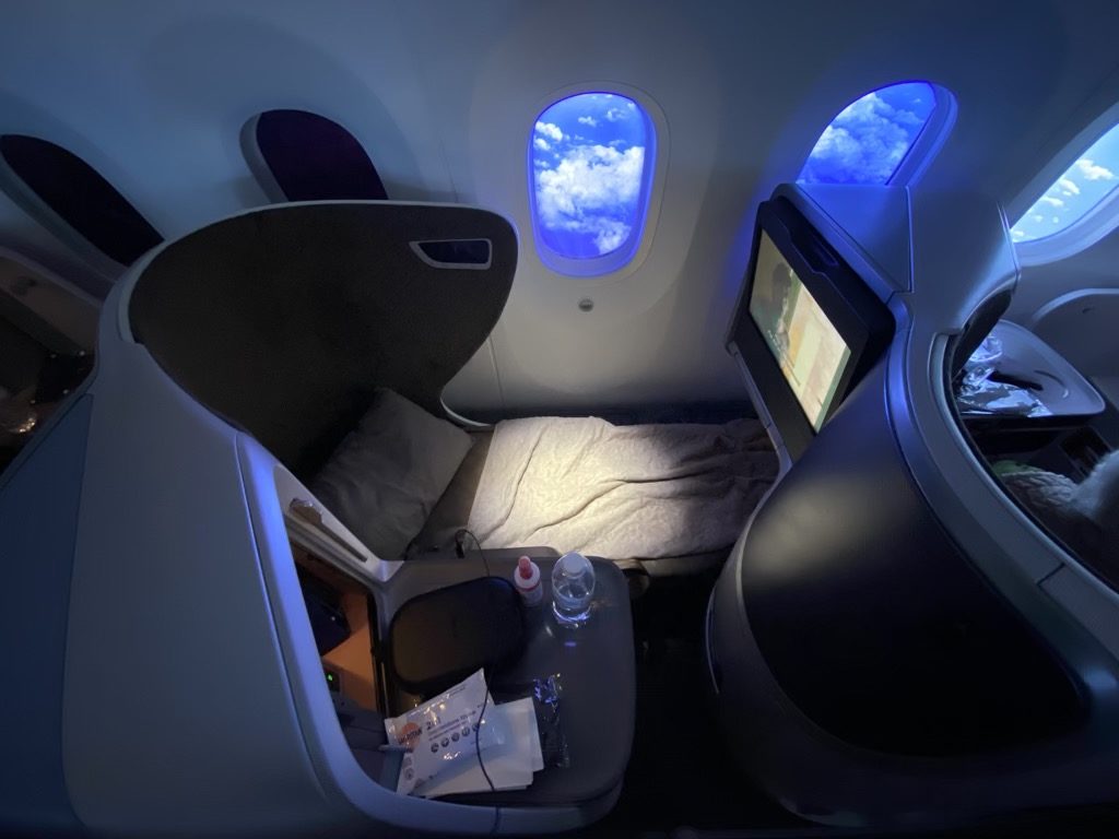 Solltet Ihr auf Eurem Flug schlafen wollen, steht euch ein 193 cm langes Bett zur Verfügung. Hier gibt es für mich jedoch zwei Kritikpunkte. Der erste Punkt ist betrifft die Gangplätze, denn man würde relativ offen zur Kabine schlafen. Auch nicht ganz so positiv empfand ich die Fußablage, welche ziemlich eng war. Nun auch noch ein Punkt zu den Fensterplätzen: bei diesen fiel mir auf, dass der Gang zum Gang ziemlich schmal ist und für korpulentere Personen eher ungeeignet scheint.