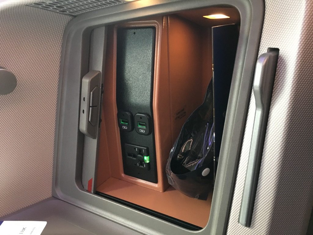 Der Sitz in der Singapore Airlines Business Class in der Boeing 787-10 verfügt über sehr viel Ablagefläche und Staumöglichkeiten. Neben der großen Ablage neben jedem Sitz gab es auch noch ein Fach in welchen man z.B. die Kopfhörer verstauen konnte.