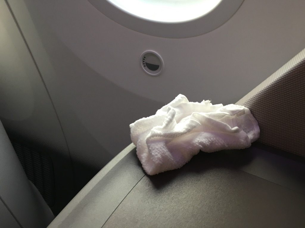 Noch am Boden wurde zur Begrüßung Wasser, Saft und Champagner angeboten. Zusätzlich gab es noch ein heißes Tuch vor dem Start.
