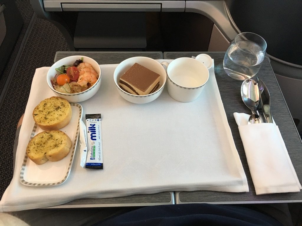 So wird das Essen von einem Servierwagen serviert und man erhält auf einem Tablett die Vorspeise, das Dessert und einen Brotteller. Zusätzlich wird jedem Passagier ein Glas Wasser eingeschenkt und man bietet Wein an. Besonders wenn man etwas anderes aus dem großen Getränkeangebot von Singapore Airlines trinken will, scheint dies die Flugbegleiter immer sehr aus dem Konzept zu bringen, da es nicht auf dem Wagen ist.