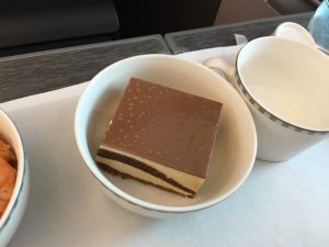 Das Huhn als Hauptspeise hat geschmeckt, mich aber auch wieder nicht sonderlich begeistert, da es alles recht langweilig und ein wenig fad geschmeckt hat. Für einen zwei Stunden Flug war es aber absolut adäquat. Das Geschmackvollste an diesem Gericht war die kleine Tomate am Rand, was schon recht viel aussagt.