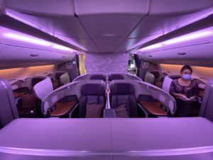 Kleine Ergänzung: nur die Mittelsitze in der jeweils ersten Reihe (also 3×2) lassen sich in eine Art Doppelbett verwandeln. Dort sind meist auch Bassinets platziert und meist nur für Familien mit Kleinkindern buchbar. Wir haben den extrem großzügigen Platz sehr genossen.