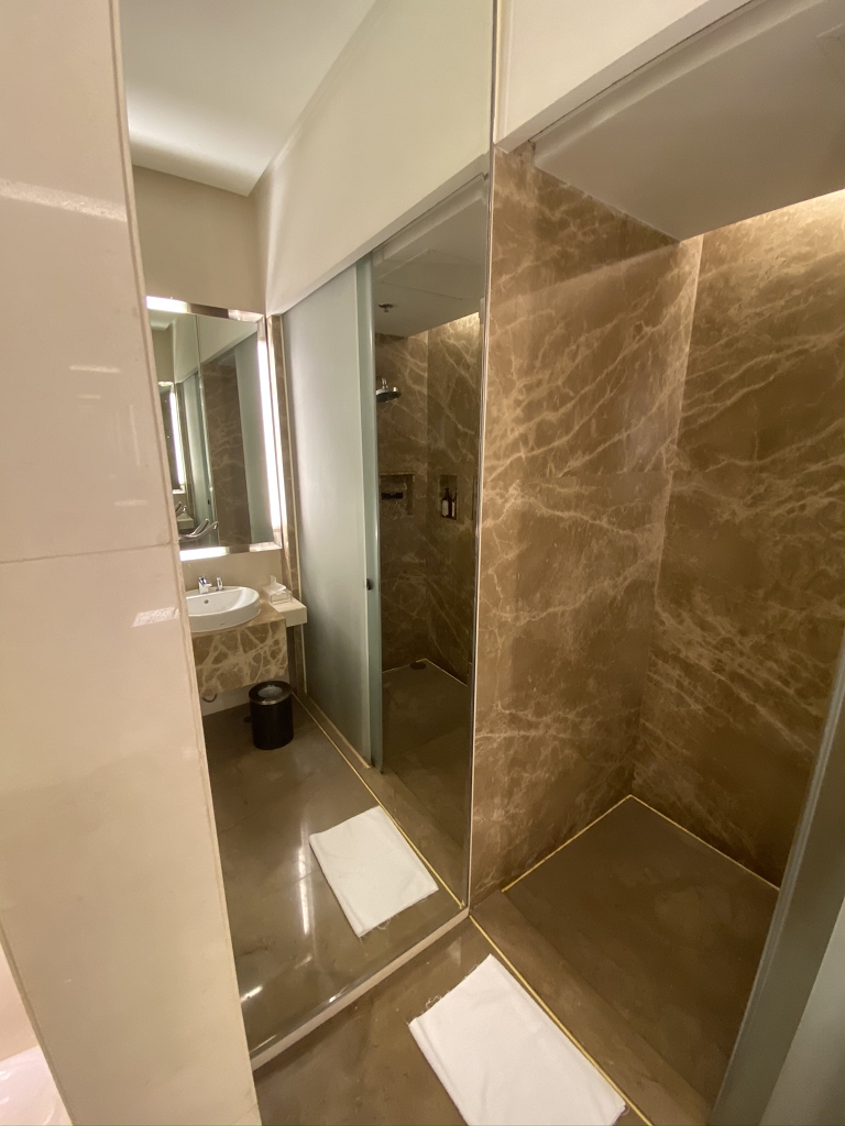 In der Nähe des Eingangbereichs (ca. gegenüber den Sofas) liegt der Nassbereich der Lounge. Es gibt Duschen, die Gäste der Lounge kostenfrei nutzen dürfen. Sollte es zu Wartezeiten kommen gäbe es eine Warteliste, nachts um 1 Uhr könnte man jedoch auch während des Duschens die Kabine wechseln ohne Aufsehen zu erregen – zumindest so lange man der einzige Reisende in der Lounge ist.