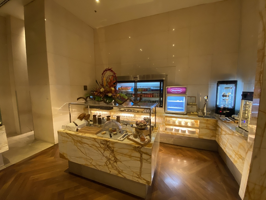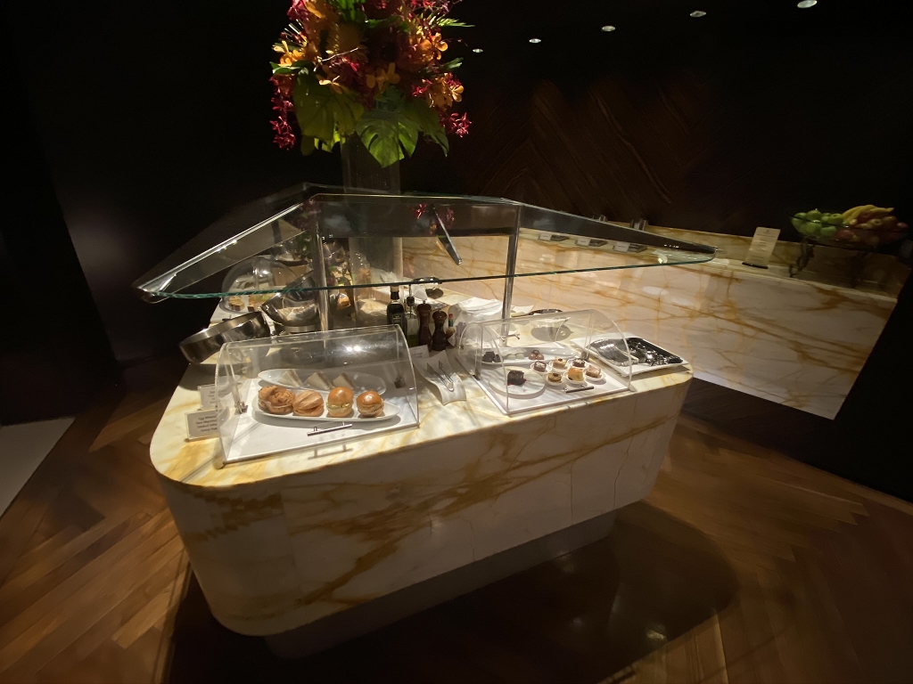Das Buffet wechselt mehrmals am Tag. Mal gibt es Obst, Sandwiches usw., zu anderen Zeiten gibt es Kuchen und Teilchen. Alles was da lag, schmeckte in Ordnung, aber nicht spektakulär. Wer die Zeit hat, sollte unbedingt Essen von der Karte im Restaurant bestellen.