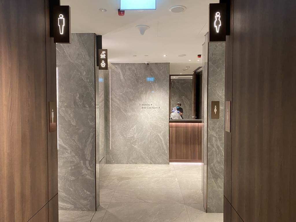 Die Singapore Airlines Business Class Lounge lässt sich zur besseren Orientierung in vier Bereiche aufteilen. Nach dem Check-In an der Rezeption landet Ihr quasi in einem Durchgangsbereich, in dem sich schon einige Sitzgelegenheiten und auch ein Service-Desk befinden. Hier gelangt Ihr außerdem auch zu den Toiletten.