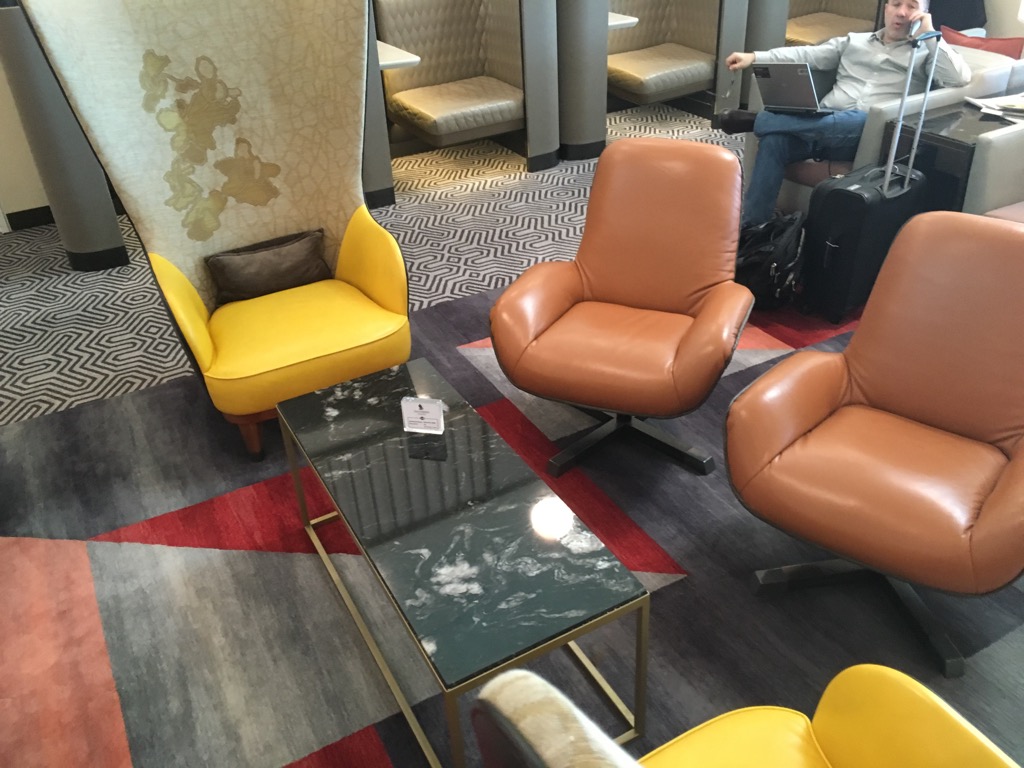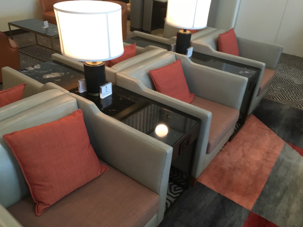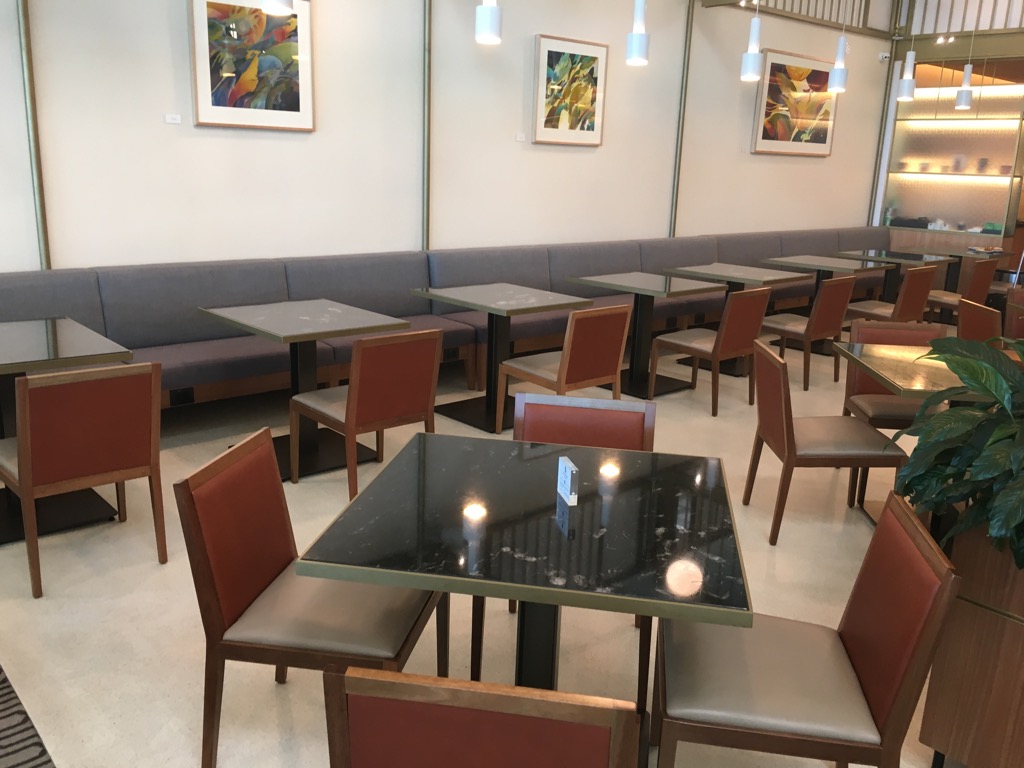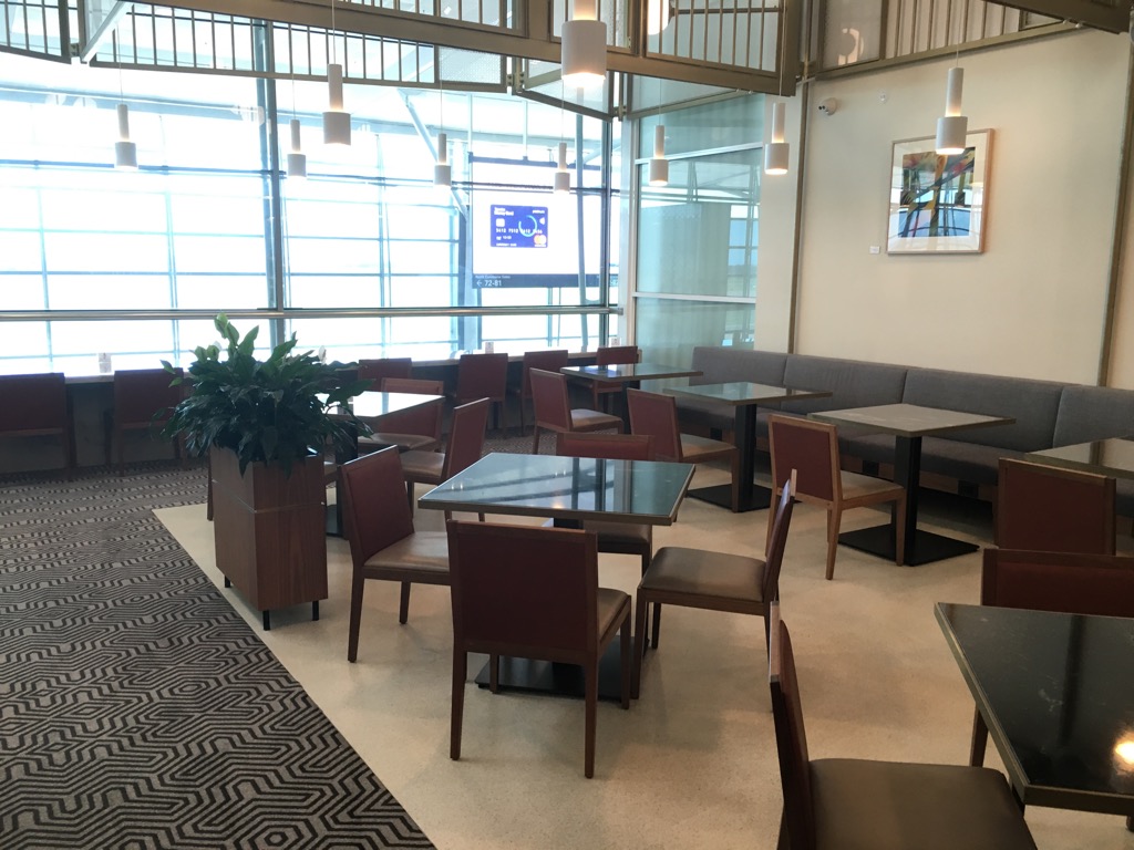 Weiter hinten befand sich die eigentliche Lounge. Diese ist offen zum Terminal und daher sehr hell. Im rechten Teil der Lounge befindet sich ein großer Dining Bereich mit vielen Tischen und Stühlen.