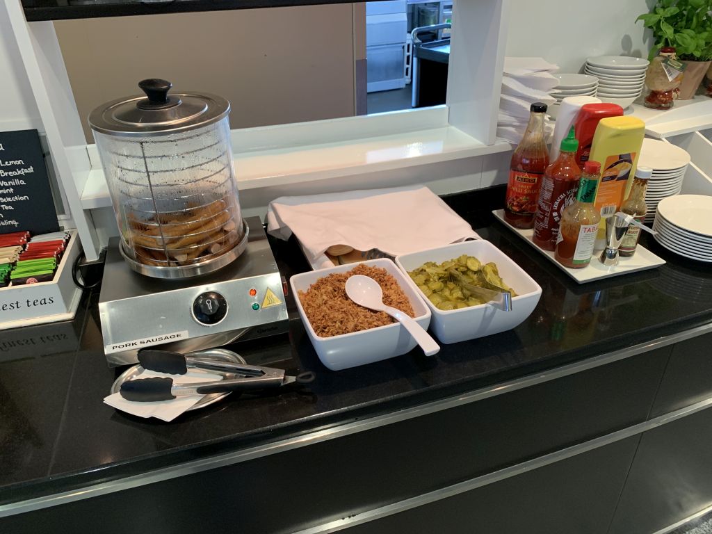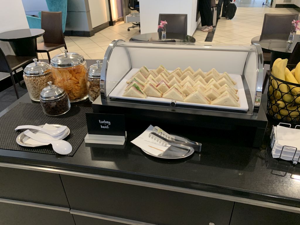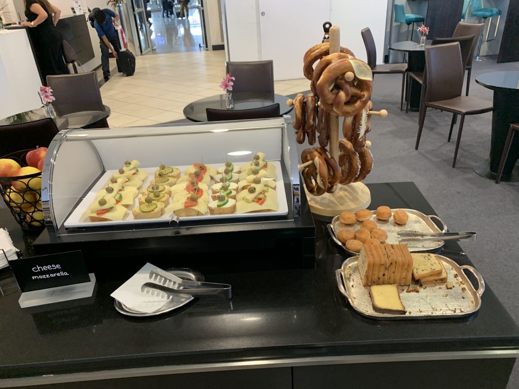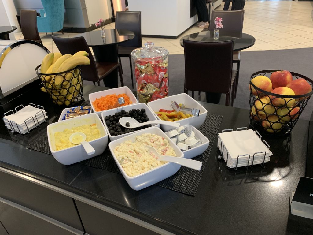 Ja, wir kamen wirklich wegen der Hotdogs in die Sky Lounge. Und wir sind deswegen wirklich zwischen Terminal 1 und 2 gewechselt. Während die Luxx Lounge in Terminal 1 ebenfalls immer das gleiche Catering auffährt, finde ich das hier nicht störend, auch wenn die Hotdogs neben Suppen die einzig warmen Optionen sind. Daneben gibt es aber noch diverse Sandwiches und Canapees, sowie Brezel und Kartoffelsalat.