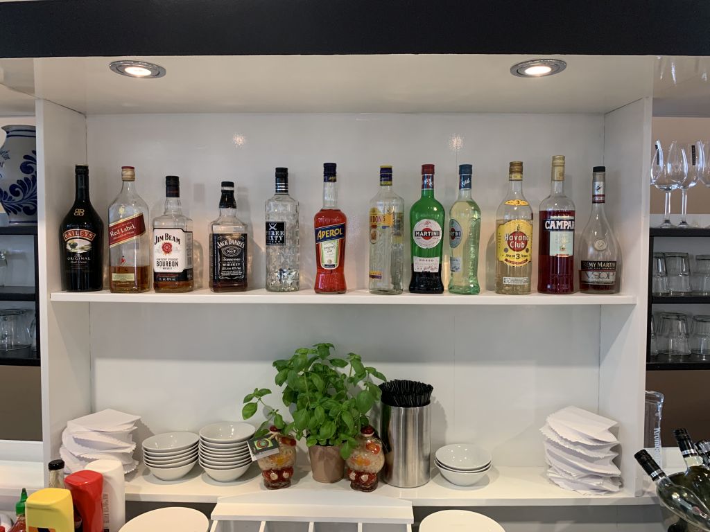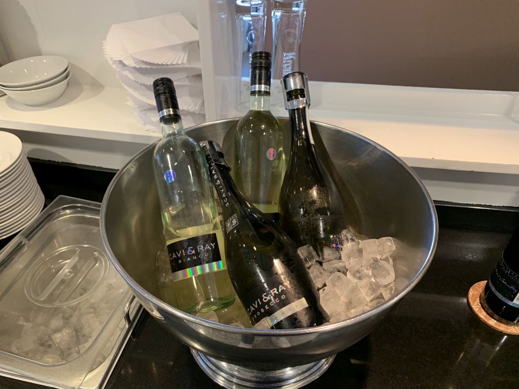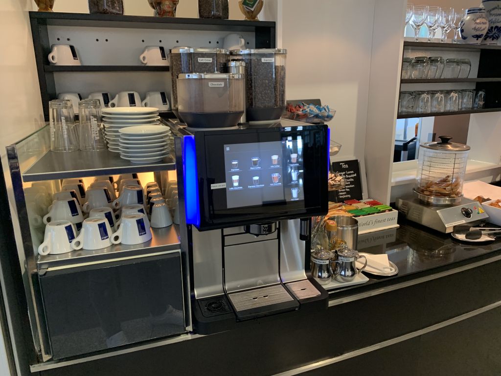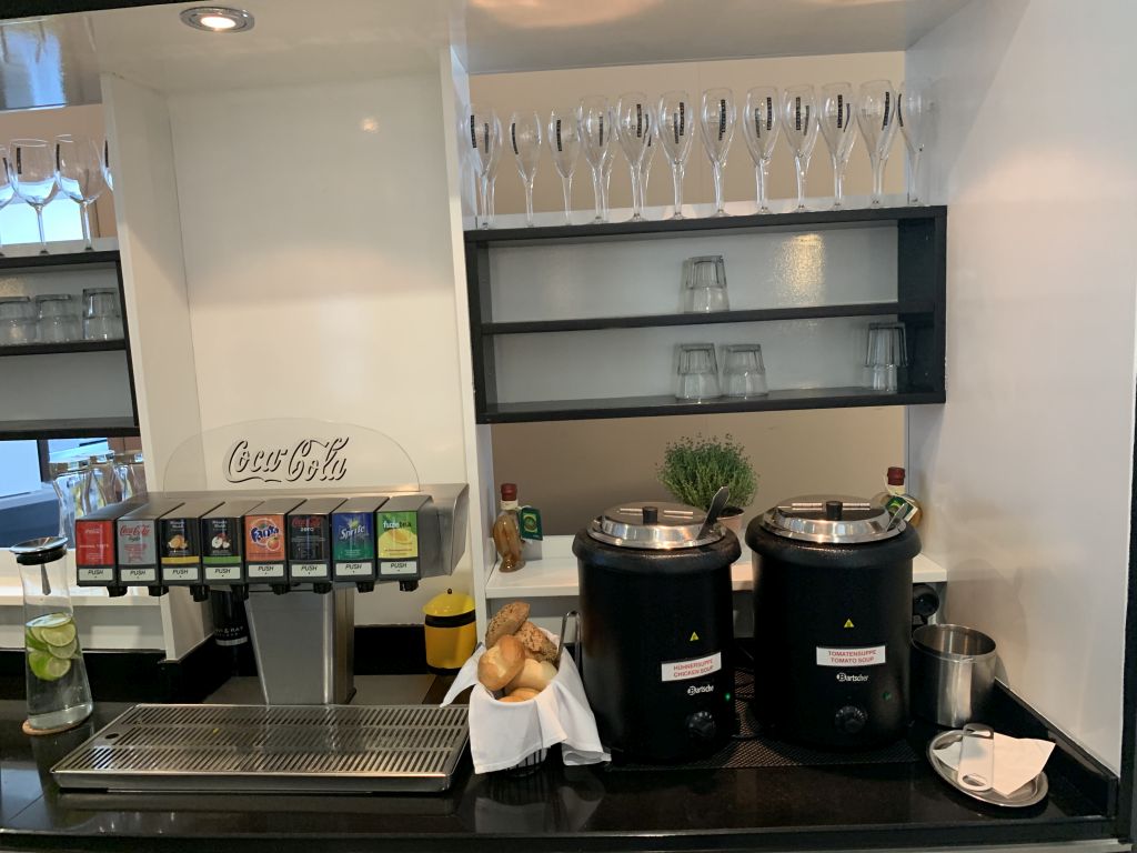 Die Getränke-Auswahl ist im Vergleich zu anderen Lounges schon recht umfangreich. Neben diversen antialkoholischen Getränken standen in den Kühlschränken auch Flaschenbiere, wie Krombacher Pils und Weizen, sowie Frankfurt Apfelwein bereit. Softdrinks wie Cola und Fanta konnte man sich selber zapfen. In der Spirituosen-Theken fanden wir zum Beispiel Gordon’s Gin, Three-Sixty Wodka und Havanna Club. Die Auswahl an Whiskey ist mit Jim Beam, Johnny Walker Red Label und Jack Daniel’s ziemlich breit ausgelegt.