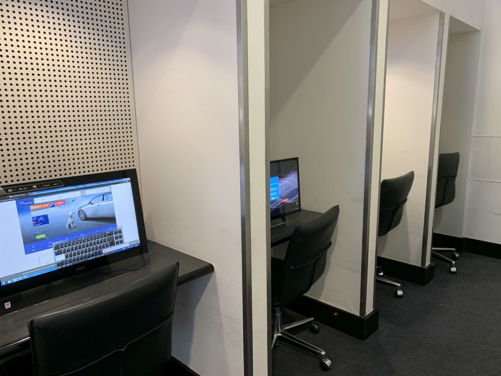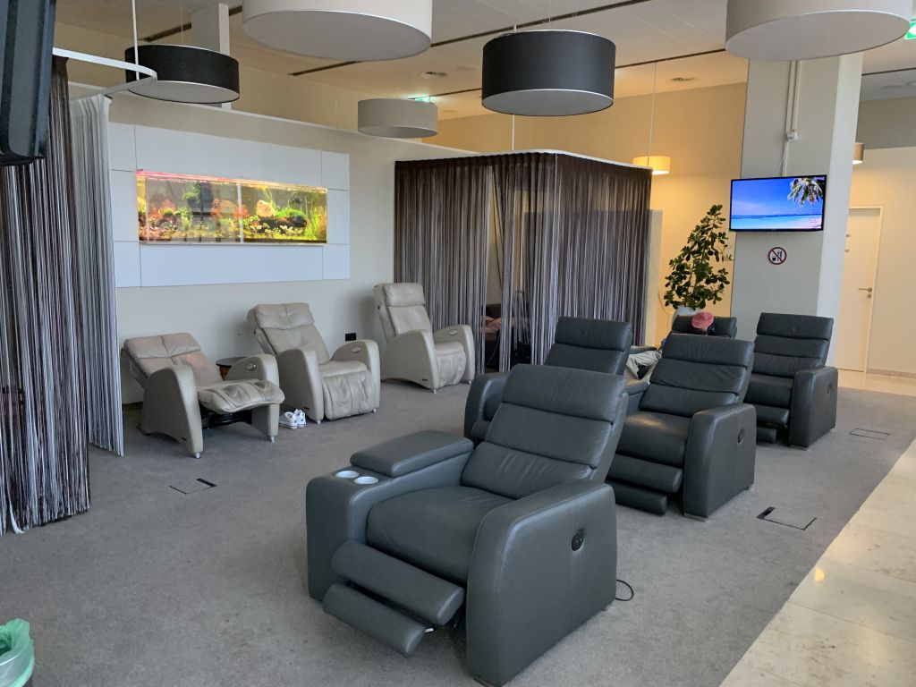 Neben dem Hauptbereich der Lounge gibt es noch einen Nebenraum, der als Ruhebereich dient. Diesen erreicht Ihr über einen Gang, in dem auch eine Computer-Arbeitsplätze eingerichtet sind. Im Ruhebereich könnt Ihr in bequemen Liege-Sesseln Platz nehmen. Auch zwei Separees sind vorhanden, in denen Ihr vor dem Abflug noch ein wenig Erholung finden könnt.