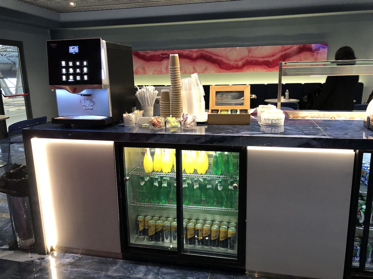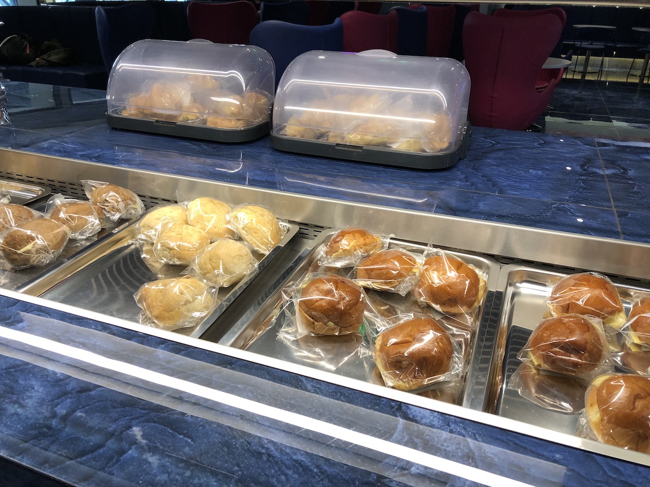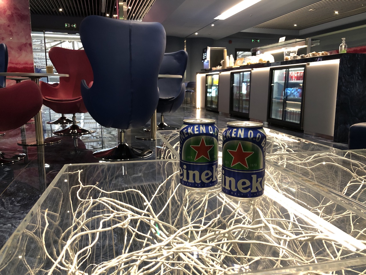 Die Lounge ist relativ klein und überschaubar, zum Zeitpunkt der Review waren kaum Gäste anwesend. Das Interieur wirkt sehr neu und modern, Farben und Design sind Geschmacksache. Die intensiven Rot- und Blautöne dominieren.